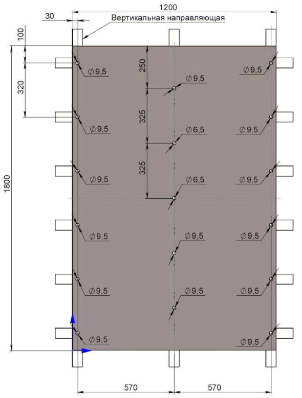 Пример расположения монтажных отверстий на листе 1800х1200х8 мм в вертикальном положении.