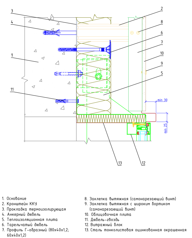 6. Все крепежные элементы конструкции должны быть изготовлены из одинаковых материалов (запрещается использование оцинкованных заклепок на алюминиевой подсистеме и наоборот).
